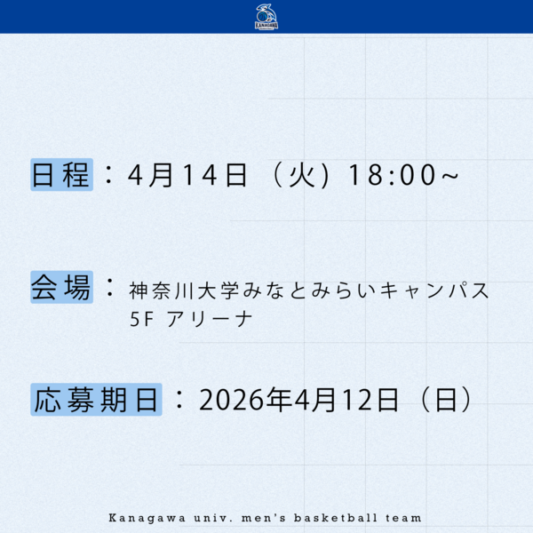 『KUCAMP 2026』ご来場の皆様へ日頃から神奈川大学男子バスケットボール部を応援して頂きまして誠にありがとうございます。今シーズンも開催することが決定したKUCAMP 2026。下記、詳細となります。♦︎日程2026年3月17日(火)、18日(水)、19日(木)、20日(金)♦︎日程表:当部のインスタグラムにて公開しておりますの...
